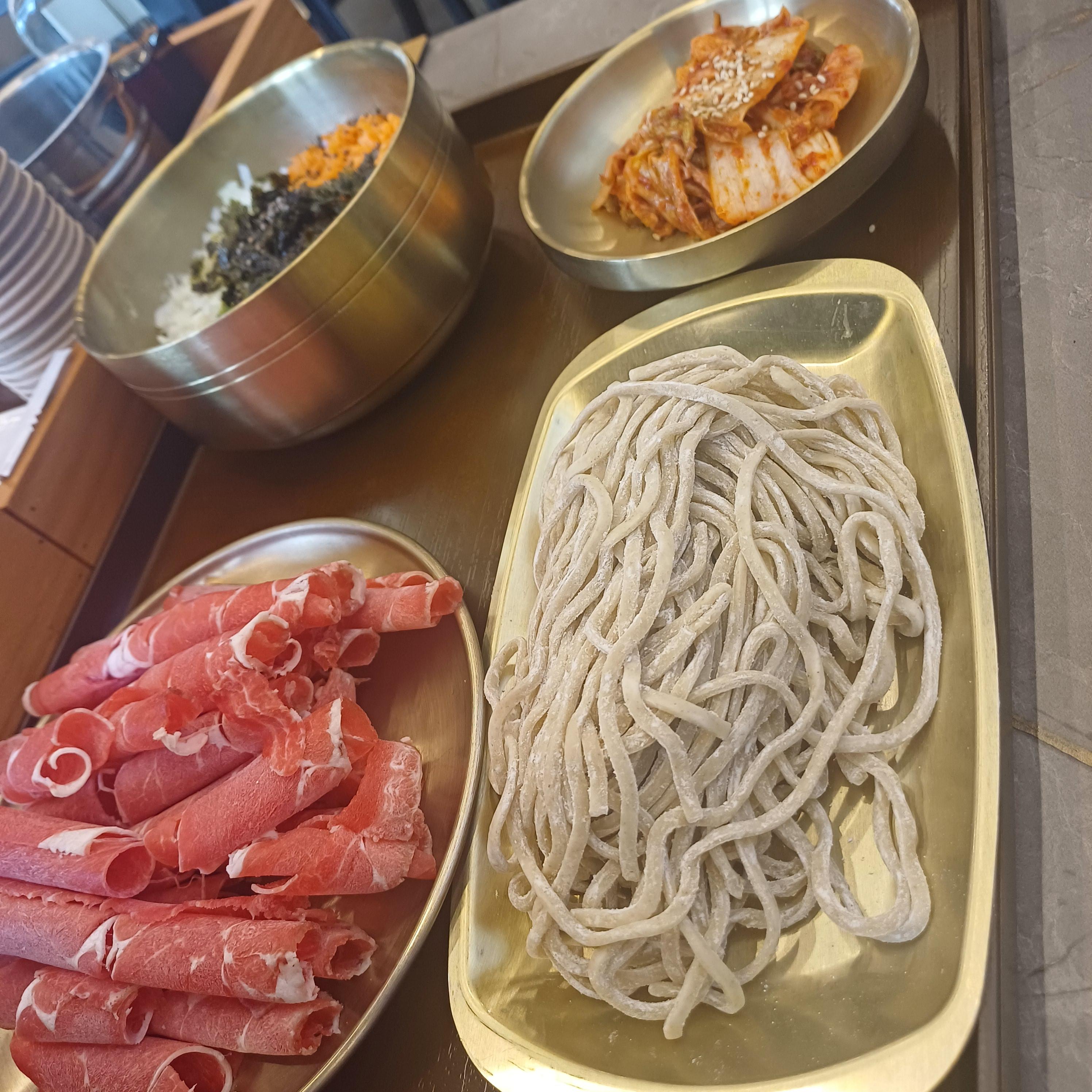 저희가 주문한 메뉴는 이름만 들어도 든든한 한상가득 스페셜 상황샤브칼국수였어요. 샤브샤브와 함께 알곤이찜, 수육까지 포함된 구성이 정말 푸짐했죠. 게다가 셀프바에서 마음껏 즐길 수 있는 소고기묵밥까지! 거기에 참기름, 들기름을 살짝 넣어 비벼 먹으면 세상 맛있었어요. 역시 호밀원샤브칼국수는 제대로 된 김포 샤브샤브 맛집이더라구요.